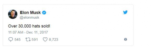 這個數字是馬斯克三周前頒布頒發銷量的兩倍,而該公司生產帽子的數量將被限制在 5 萬頂,所以如果目前的銷售勢頭不亂,,這家公司的帽子很快就賣完了。