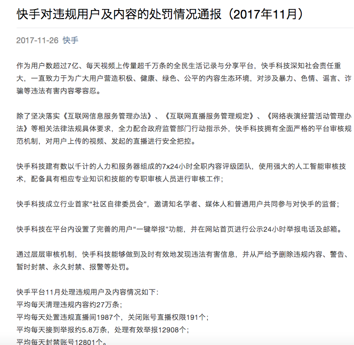 近日,快手官方公布 11 月針對違規用戶及內容的處罰情況通報。作為全球最大的短視頻分享平臺,快手的月度審核舉措一直頗受外界關注。