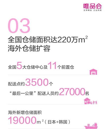 快速、高效、安適的把貨物送達(dá)給用戶,這是唯品會(huì)品駿物流始終堅(jiān)持的初衷與使命,也是唯品會(huì)不停加大力度持續(xù)升級(jí)智能倉(cāng)儲(chǔ)、智能物流能力所期望達(dá)到的效果。唯品會(huì)通過(guò)電商+物流+金融“三駕馬車(chē)”戰(zhàn)略,重組物流板塊,加大物流布局, 進(jìn)一步加快物流運(yùn)輸速度,帶動(dòng)用戶滿意度的提高。截至目前,唯品會(huì)擁有遍布國(guó)表里的 5 個(gè)保稅倉(cāng)、 14 個(gè)前置倉(cāng) 和 9 個(gè)海外倉(cāng),并為其跨境業(yè)務(wù)新增了約2. 3 萬(wàn)平方米的倉(cāng)庫(kù),倉(cāng)儲(chǔ)總面積達(dá) 240 萬(wàn)平米;加之 250 多條公路運(yùn)輸干線、各大航空公司的貨運(yùn)專屬艙位、國(guó)內(nèi) 5 大倉(cāng)儲(chǔ)物流中心、覆蓋全國(guó)縣、鄉(xiāng)鎮(zhèn)的 3700 多個(gè)自營(yíng)配送點(diǎn)等等,這支超過(guò) 27000 人的專業(yè)團(tuán)隊(duì),日配送包裹能力已經(jīng)可以達(dá)到 500 萬(wàn)單/天。