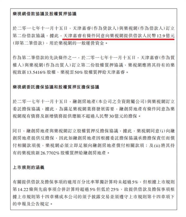 按照該公告, 2017 年 11 月 15 日,天津嘉睿(融創中國擺設控制的貸款人)與樂視致新(借款人)、樂視網(擔保人)簽訂第一份借款協議,天津嘉睿有條件向樂視致新提供借款人民幣 5 億元,用于樂視致新的一般運營資金。