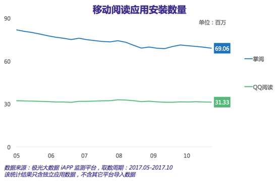 極光大數據顯示,掌閱和QQ閱讀獨立應用端的用戶安置數量均達到千萬量級水平。截至 10 月份最后一周,掌閱的用戶安置數量為6, 906 萬,而QQ閱讀則為3, 133 萬。