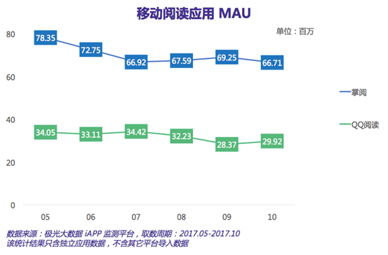 在MAU(月活躍用戶數)上,安置規模占優的掌閱再度領先。截至本年 10 月份,掌閱的MAU數據為6, 671 萬,,而QQ閱讀則為2, 992 萬。