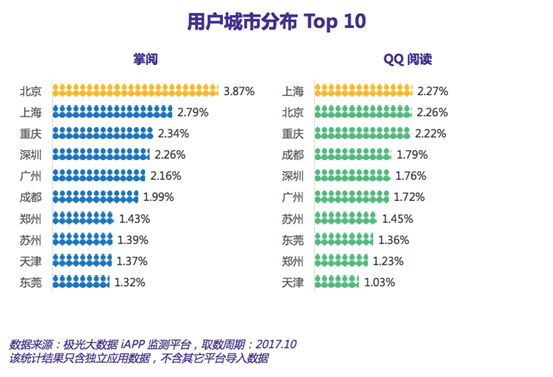 用戶城市分布數據顯示,北京、上海和重慶用戶的占比在兩款應用中均占據前三位。截至 10 月底,掌閱用戶占比最高的城市是北京(3.87%),而QQ閱讀則是上海(2.27%)。