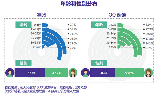 用戶比例數據顯示,兩款平臺在用戶性別比例上有著顯著的差異:掌閱用戶中男性占比達57.3%,而QQ閱讀比例更高的則是女性用戶,占比為53.6%。
