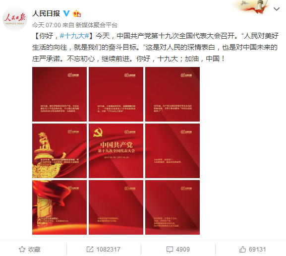 在主流媒體的帶動下,十九大相關(guān)內(nèi)容迅速成為網(wǎng)民關(guān)注的熱點。截止 10 月 18 日 12 點,十九大相關(guān)微博話題閱讀總量超過 50 億次,比前一天增加 16 億次,討論量超過 200 萬條,比前一天增加 48 萬條。@人民日報 當天 7 點發(fā)布的微博“你好,#十九大#”, 10 個小時的轉(zhuǎn)發(fā)量超過 100 萬次。@新華視點、@央視新聞、@中國日報、@中國青年報 等媒體發(fā)布的多條微博,也獲得網(wǎng)友積極轉(zhuǎn)發(fā)。“十九大開幕”、“直播十九大”、“房子是用來住的”、“新時代的社會主要矛盾”等 10 多個與十九大相關(guān)的關(guān)鍵詞,也進入微博熱搜榜。