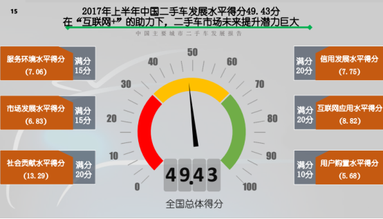 本陳訴以瓜子二手車直賣網海量數(shù)據(jù)為基礎,并結合其他平臺公開數(shù)據(jù),采用百分制從辦事環(huán)境水平、市場發(fā)展水平、社會貢獻水平、信用發(fā)展水平、互聯(lián)網應用水安然安祥用戶購置水平六個方面建立科學的評價指標體系,對我國30個主要城市的二手車市場發(fā)展水平進行評估。結果顯示,2017年上半年全國二手車發(fā)展水平平均分為49.43分,處于發(fā)展較低的階段,得分前十的城市為北京、上海、武漢、成都、廣州、天津、深圳、重慶、南京和鄭州。