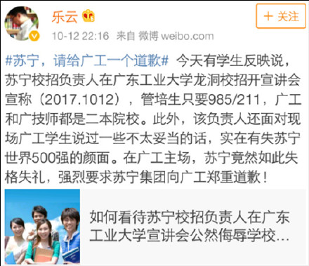 近日,蘇寧校招負責人在該校召開的宣講會宣稱:“管培生只要985/211,廣工和廣技師都是二本院校?!辈⒎Q該負責人還面對現(xiàn)場廣工學生說過一些不太安妥的話。隨后引起了廣工學生強烈不滿。