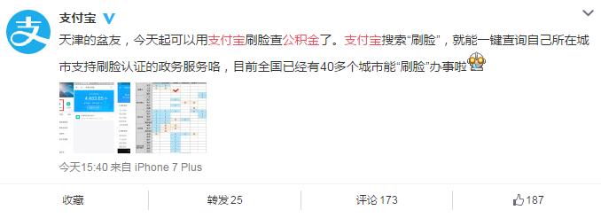今日支付寶官方微博宣布,“天津的盆友,今天起可以用支付寶刷臉查公積金了。支付寶搜索“刷臉”,就能一鍵查詢自己所在城市支持刷臉認證的政務(wù)服務(wù)咯,,目前全國已經(jīng)有 40 多個城市能“刷臉”辦事啦”。