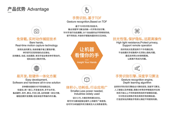 最新版本的模組方案采用先進的算法,不需要帶手套操作的繁瑣步驟,,支持靜態識別、動態追蹤、單雙手組合的多種手勢動作。比擬較其他的一些方案,火星一號有著抗光性強、支持遠距離操作、掩護隱私、體積小、功耗低等特點。而且模組可以支持移動版、PC版使用及開發,可以適用于差別的使用場景。