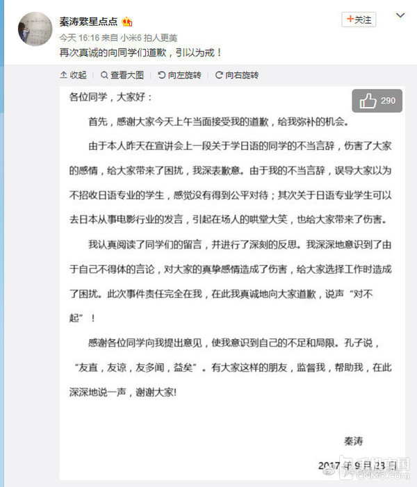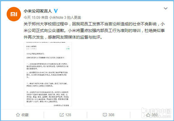 事件引發(fā)關注后,涉事員工隨后在個人微博發(fā)布聲明,承認本身當時言辭不當,并稱已在當日上午向?qū)W生當面報歉。小米方面也體現(xiàn),此問題反映出在HR工作上存在員工培訓嚴重不足的情況,公司將盡快完善相關制度,杜絕此類事情再次發(fā)生。