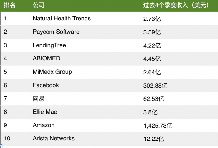 雷鋒網(公眾號:雷鋒網)消息,《財富》雜志日前發布了美股“ 100 家增長最快的公司”,美國自然健康時尚集團排名第一,,Facebook、亞馬遜、網易等排進前十。除了網易排名第七,上榜的中國公司還有好未來教育集團、唯品會、晶科能源、汽車之家、歡聚時代、諾亞控股等。