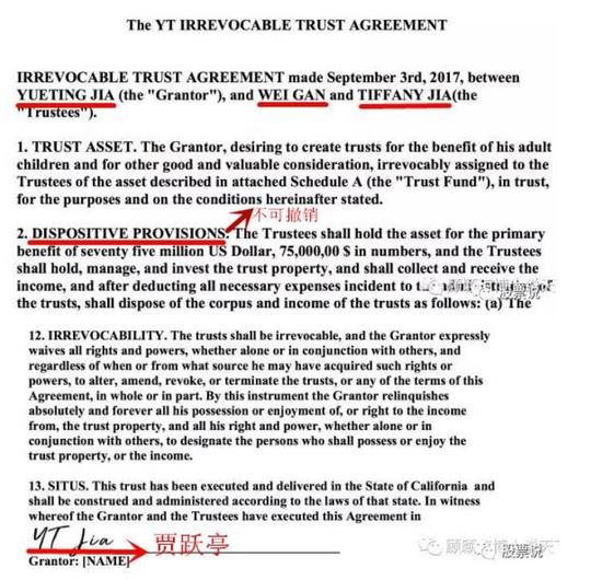 站長之家(Chinaz.com) 9 月 14 日消息 日前,有消息稱賈躍亭成立了海外信托,信托文書上顯示,賈躍亭給其中一個女兒留了 7500 萬美金,約合五億人民幣,甘薇是信托基金守信委托人。