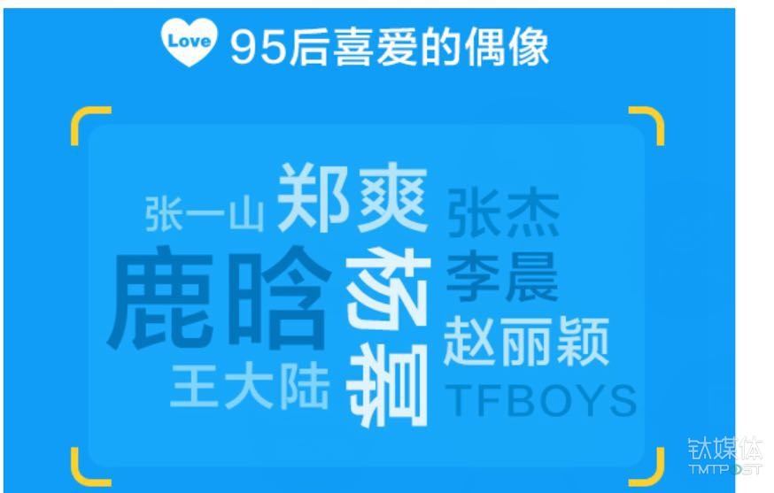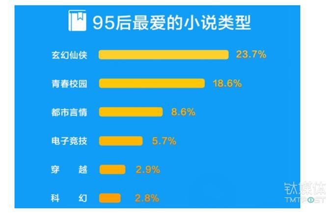 關(guān)于 95 后最愛的小說類型,校園題材在 95 后人群中占比為18.6%,僅次于玄幻仙俠類的23.7%; 95 后最喜愛的偶像仍集中在鹿晗、TFBOYS、楊冪、趙麗穎這樣的陽光少年和鄰家少女。
