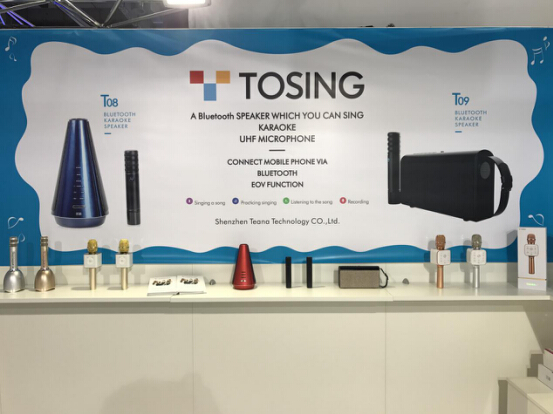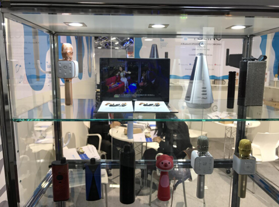 筆者參不雅觀該展位后,了解到,途訊展出的產品,是一種麥克風與喇叭結合的一體機,通過藍牙連接手機后,打開手機內的K歌APP,就可以隨時K歌,還帶有混響和消除原音的功能。
