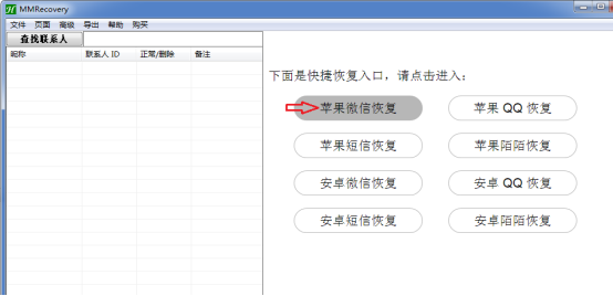 首先運行恢復工具MMRecovery,,如下圖在右側快捷恢復入口,點擊 “蘋果微信恢復 ”按鈕,將會彈出“微信恢復向導”對話框。