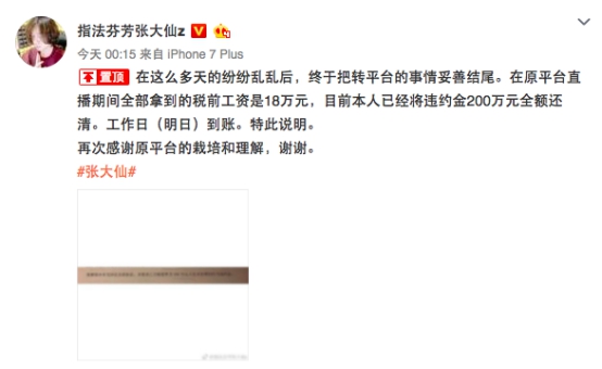 在違約跳槽斗魚后,原企鵝電競平臺主播張大仙于 9 月 4 日凌晨通過微博表白“目前本人已經將違約金 200 萬元全額還清”。而日前,其收到了法院禁播令,禁止其在企鵝電競直播平臺之外進行直播行為。 9 月 4 日,張大仙微博聲稱已經將違約金全額還清。