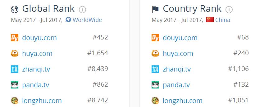中國部分直播網站排名(世界和中國)(數據來源:SimilarWeb)