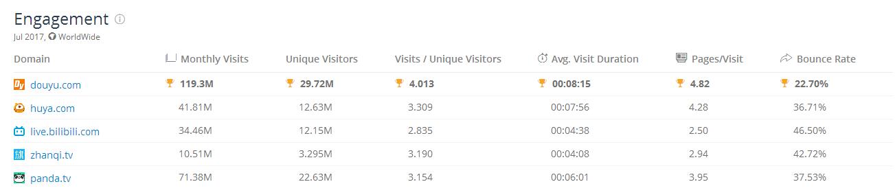 從近一個月的網站互動量來看(包羅日平均拜候數、日平均拜候時長、打開次數、跳出率等等),斗魚幾乎在所有數據中取得了競品最高水平,月拜候人數在近一個月中超過 1 億人,獨立拜候量是虎牙、Bilibili的兩倍以上。平臺高用戶粘性、活躍度成為斗魚高用戶價的基礎。
