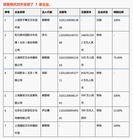 近兩年來,盡管沒有新作品面世,郭敬明商業(yè)拓展的腳步一刻不竭。據(jù)企查查顯示,郭敬明是 6 家公司的法定代表人,別離為上海雙子惠蘭文化創(chuàng)作室、上海最線代動漫文化發(fā)展有限公司、上海柯艾文化傳播有限公司、上海最世文化發(fā)展有限公司、上海令秧文化傳播有限公司、上海遐邇文化傳播創(chuàng)作室。