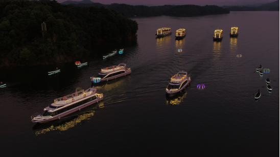 象征仙女湖七仙女的燈籠形狀無人機在湖面上結伴飛行