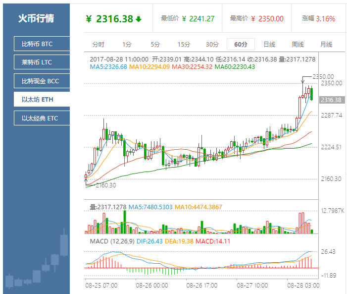 按照以太坊交易平臺火幣網(wǎng)行情顯示,截至北京時間 8 月 28 日 11 點(diǎn),以太坊價格為2316. 38 元人民幣。火幣網(wǎng)以太坊今日開盤價格為2245. 30 元,目前最高價格為2350. 00 元,最低價格為2241. 27 元,漲幅3.16%。