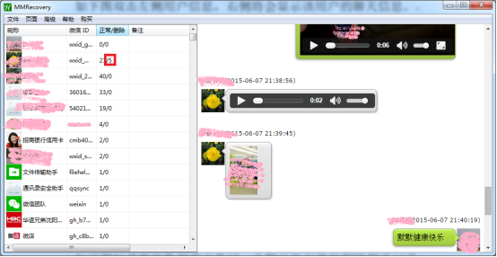 如下面的微信記錄恢復效果圖中雙擊左側微信用戶,右側將會顯示當前用戶的聊天信息,圖中紅色方框中的“5”體現恢復出來的已被刪除的聊天記錄的數量。