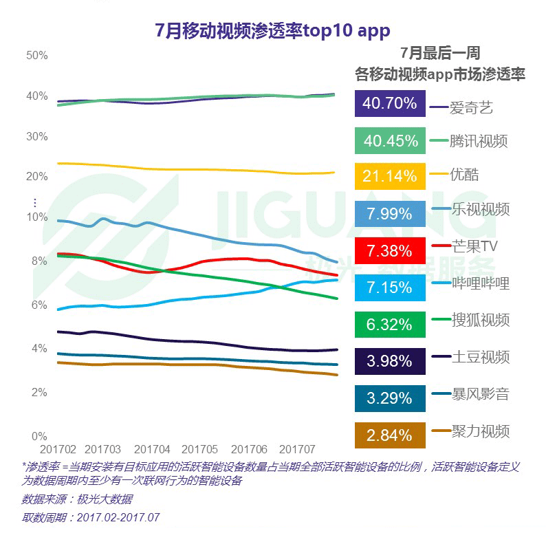 ? 按照極光大數據統計,截至 2017 年 7 月最后一周,市場滲透率top3 的移動視頻app別離是愛奇藝、騰訊視頻和優酷,其市場滲透率別離為40.70%、40.45%和21.14%