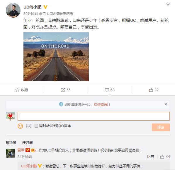 站長之家(Chinaz.com)8月22日消息:今日,UC優視聯合創始人何小鵬在其個人微博發文頒布頒發卸任:“創業一輪回,苦辣酸甜咸,開心歸來還是少年!感謝所有,祝福UC,多謝用戶。新輪回,是終點,也是起點,顛覆本身,享受出發。”