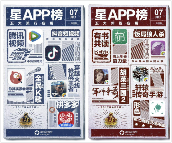 在騰訊應用寶“星APP” 7 月榜中,除“形色”外,“飯局狼人殺”、“有書共讀”、“胡萊三國2”、“軒轅傳奇手游”、“騰訊視頻”、“抖音短視頻”、“拼多多”、“全民K歌”、“穿越火線-槍戰王者”等九款應用,也均在上線更新、近期下載、下載飆升、用戶好評、評論活躍、社交分享等六大維度上表示優異,登頂榜單。