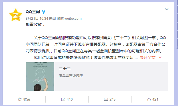 關于QQ空間配圖搜索功能中可以搜索到電影《二十二》相關配圖一事,QQ空間團隊已第一時間查證并下線所有相關配圖。經核查,該配圖由第三方合作公司心情云提供,目前QQ空間正在與其一起全面核查圖庫中的可能相關的內容。
