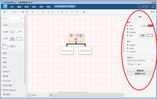 選擇圖形素材并對整個流程圖繪制完整后,我們還可以對配景進行修改。選中配景部分后,在右側的“圖表”版塊中,可以選擇是否需要網格、參考線等內容,以及對配景顏色進行設置。