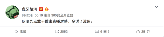 兩方粉絲對噴也愈演愈烈,嗨氏受不了壓力停播,發(fā)微博貼出15日直播回放,聲稱本身沒有瞧不起其他游戲?qū)^(qū)的主播。楚河長文回應(yīng)只想好好直播,并微博約戰(zhàn)嗨氏“明晚九點(diǎn)敢不敢來直播對峙,多說了沒用。”