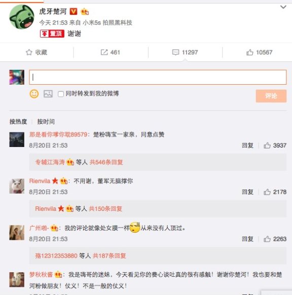 楚河在直播中幾次情緒失控,當(dāng)初水軍在直播間噴他生病的媽媽,又到微博私信罵他基友,連支持他的粉絲也受到攻擊,并說本身查過一個某魚的一個水軍用1800個號發(fā)了十幾萬條彈幕評論,兩方帶節(jié)奏。