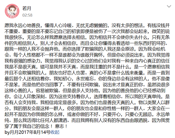 不過今天若月在空間發(fā)出一段話,似乎有點不開心,他說:愿我永遠心地善良,懂得人心冷暖。無憂無慮懶懶的,沒有太多的想法,有錢沒錢并不重要。重要的是不要忘記本身的初衷即即是被傷了一次次我都會站起來,微笑的說我很快樂,無論怎么樣我愿意選擇去相信,因為相信并不會使你失去什么,只有無條件的先相信別人,別人才會去相信你。