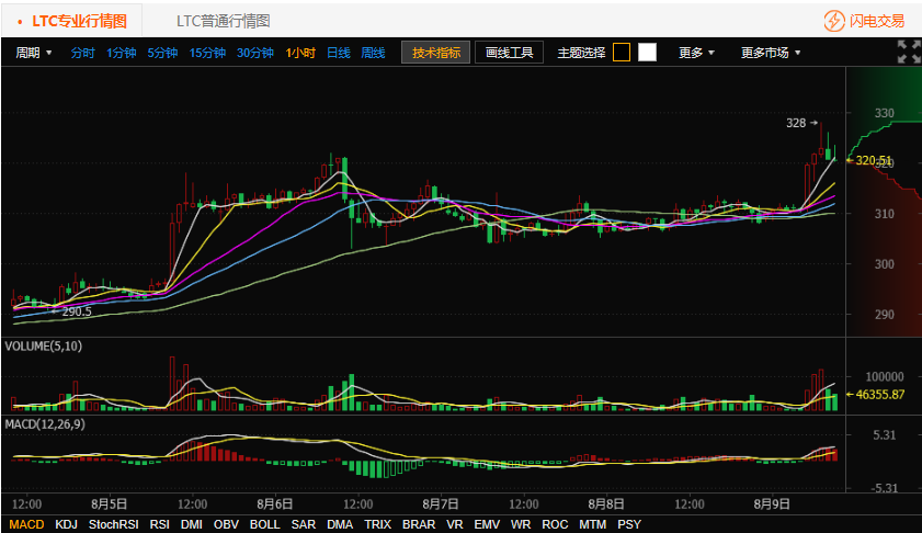 按照萊特幣交易平臺(tái)火幣網(wǎng)行情顯示,截至北京時(shí)間 8 月 9 日 10 點(diǎn),萊特幣價(jià)格為320. 51 元人民幣。火幣網(wǎng)萊特幣今日開盤價(jià)格為309. 95 元,目前最高價(jià)格為 328 元,最低價(jià)格為308. 33 元,漲幅3.42%。