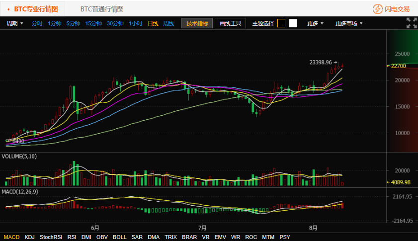 按照比特幣交易平臺(tái)火幣網(wǎng)行情顯示,截至北京時(shí)間 8 月 9 日 10 點(diǎn),比特幣價(jià)格為 22700 元人民幣。火幣網(wǎng)比特幣今日開盤價(jià)格為22588. 08 元,目前最高價(jià)格為23149. 99 元,最低價(jià)格為 22360 元,漲幅0.5%。