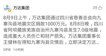 8 月 9 日上午,萬達(dá)集團(tuán)通過四川省慈善總會向九寨溝縣地震災(zāi)區(qū)捐款 1000 萬元。