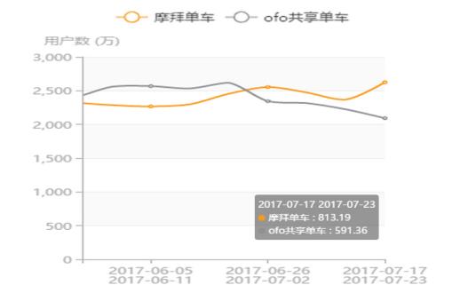 數據顯示,在周日均活躍用戶量( 7 月 17 日至 23 日),摩拜 813 萬,ofo591 萬,摩拜領先38%。其中在 6 月 5 日至 11 日~ 7 月 17 日至 23 日周日均活躍用戶量雙月走勢上,摩拜從 659 萬增長至 813 萬,,增幅為23%,ofo從 839 萬下滑至 591 萬,降幅為30%。
