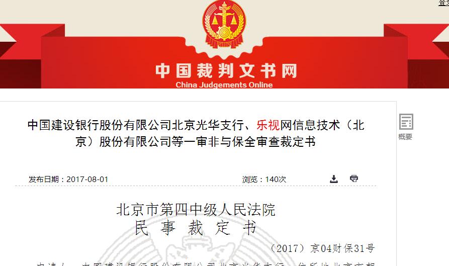 按照中國裁判文書網(wǎng)公開的消息顯示,中國建設(shè)銀行股份有限公司北京光華支行于 7 月 24 日,別離以金融借款合同糾紛為由,向法院申請財產(chǎn)保全,,請求查封、扣押或凍結(jié)樂視網(wǎng)、賈躍亭、樂視控股、賈躍民共計價值人民幣 200507500 元的財產(chǎn)。