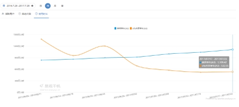 綜合來看,在 6 月、 7 月,摩拜在活躍用戶量、APP使用時長、APP使用次數等多個方面反超ofo小黃車,并持續增長,連結領先優勢。從單品牌來看,摩拜數據顛簸較小,一直處于穩步增長的態勢,ofo小黃車數據顛簸較大,處于下滑趨勢。