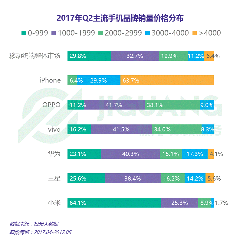 ? 通過不雅觀察極光大數據發現,62.5%的消費者在Q2 選購手機時選擇了兩千元以內的機型,不到10%的消費者選擇了價格在四千以上的機型