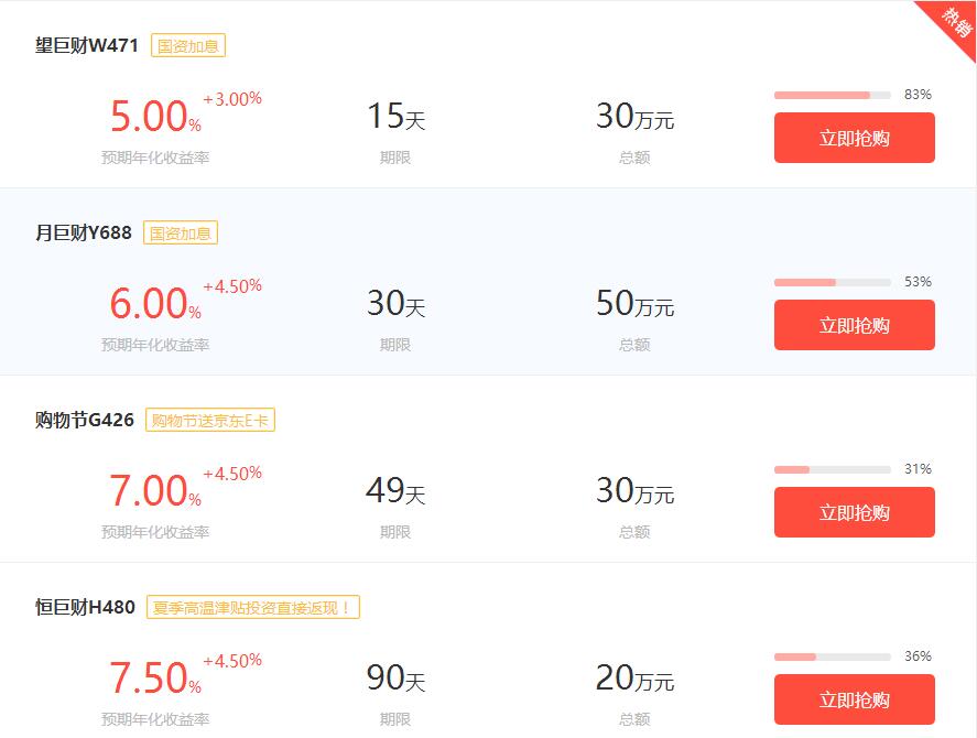 目前處在利率下行周期,市場上各種金融理財產品投資收益遍及下降。 2017 年 7 月份,銀行類理財產品的平均收益率在4.08%到4.88%。而巨人理財由于本年獲得國資100%控股,而做出全場加息的活動,現在巨人理財平臺收益在8%—12%之間,同時巨人理財還會按期開展一些活動回饋新老用戶,好比比來的免費高溫津貼、云南雙飛游、投資送京東E卡等。