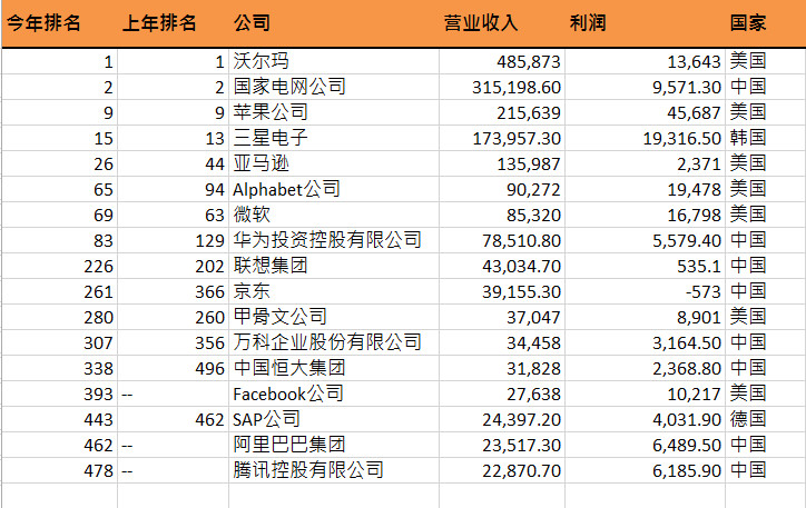 到了本年,共有 115 家中國公司入圍,國家電網(wǎng)穩(wěn)居第二,其他幾家公司的排名多有上升,華為升至第 83 位,成功挺進前百。京東則上升至第 261 名,萬科和恒大別離升至第 307 和第338。在新入圍的幾家國內(nèi)公司中,最受矚目的,莫過于阿里和騰訊。阿里以235. 17 億美元的營收居第 462 位,騰訊則以228. 7 億美元的營收位居 478 位。國外的公司中,沃爾瑪連續(xù)四年位于榜首,蘋果公司蟬聯(lián)第9,其競爭對手三星位于第 13 位,亞馬遜、谷歌母公司Alphabet、微軟各為第26、65、 69 位。本年首次上榜的Facebook位于第 393 位。在過去的一年中,阿里和騰訊營收表示優(yōu)異,進入世界 500 強是板上釘釘?shù)氖隆kS著阿里和騰訊的入圍,世界五百強中共有六家互聯(lián)網(wǎng)公司,中國和美國各占一半(美國的三家為亞馬遜、谷歌母公司Alphabet、Facebook)。