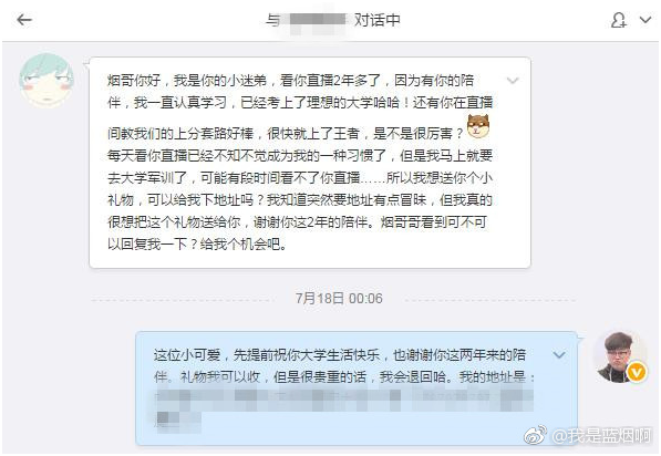 從藍煙微博曬出的私信對話截圖來看,本來是一位剛考上抱負大學的忠實煙粉,即將踏入大學生活的他,可能有一段時間不能看煙老師直播,因此為本身所愛的煙老師送上了一份“大禮”,以此感謝藍煙在游戲生活中對他的幫手,,不但教他上王者,也督促他考上抱負大學,實實在在的做到了游戲生活兩不誤!