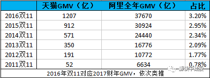 先來看阿里雙11的數據。雙11作為國內影響力最大的電商促銷節日,數據也最完整。可以看出雙11貢獻的GMV占比從2011年的0.78%上升到去年的3.2%。