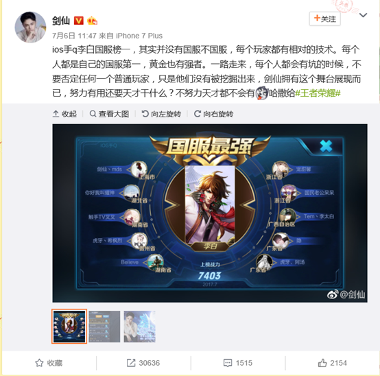 S8 賽季劍仙已經拿下國服第一李白稱號,而且戰力高于其他上榜號稱國服第一李白的主播,已經有媒體為“國服最強”榜的排序進行解析,劍仙無愧國服第一李白稱號!不過迷妹們紛紛體現,寧可劍仙少陪本身一天,多給本身一點時間。