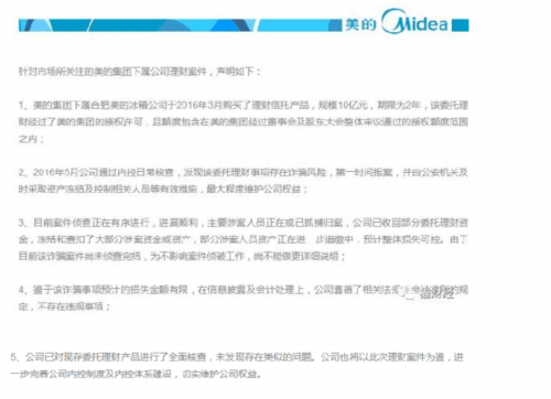 【TechWeb報(bào)道】不久前,國內(nèi)媒體報(bào)道美的集團(tuán)通過微信公眾號發(fā)布關(guān)于理財(cái)案件的聲明。聲明指出,美的集團(tuán)下屬合肥美的冰箱公司于2016年3月購買了理財(cái)信托產(chǎn)品,規(guī)模10億元,期限為2年。同年5月公司通過內(nèi)控日常核查,發(fā)現(xiàn)該委托理財(cái)事項(xiàng)存在詐騙風(fēng)險(xiǎn),第一時間報(bào)案。目前涉案人員正在或已抓捕,公司已收回部分委托理財(cái)資金。