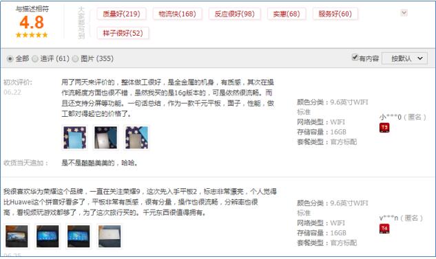 圖:天貓平臺榮耀暢玩平板 2 用戶評價