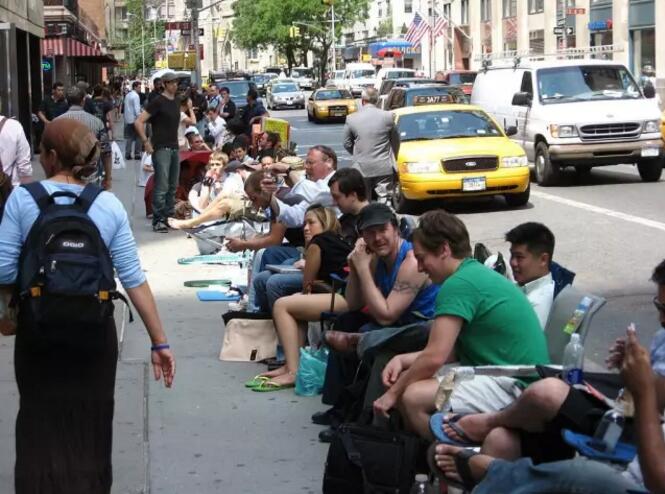 2007 年 6 月紐約Apple Store門口,裝備齊全的人們徹夜排著長隊等候iPhone的正式發(fā)售