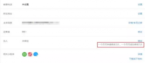 A:1個月內(nèi),法人信息,提交了之后如果審核失敗還有2次提交機(jī)會;如果審核成功一個月只能設(shè)置一次,要修改只能等下個月(自然月)。
